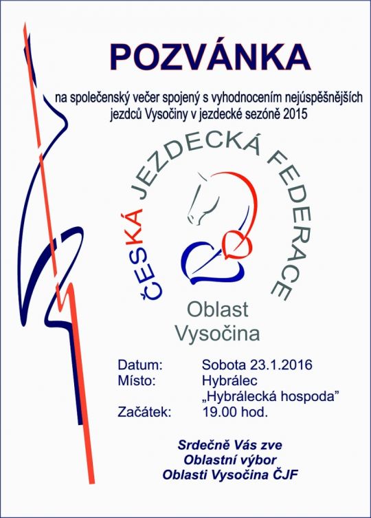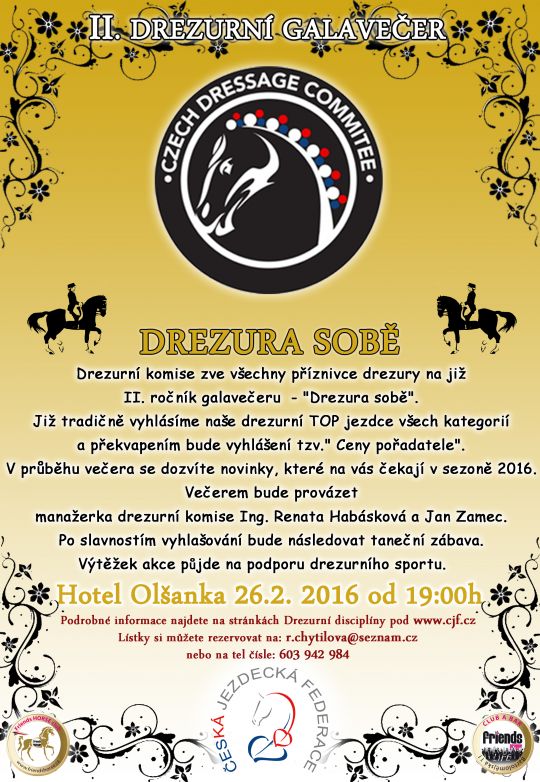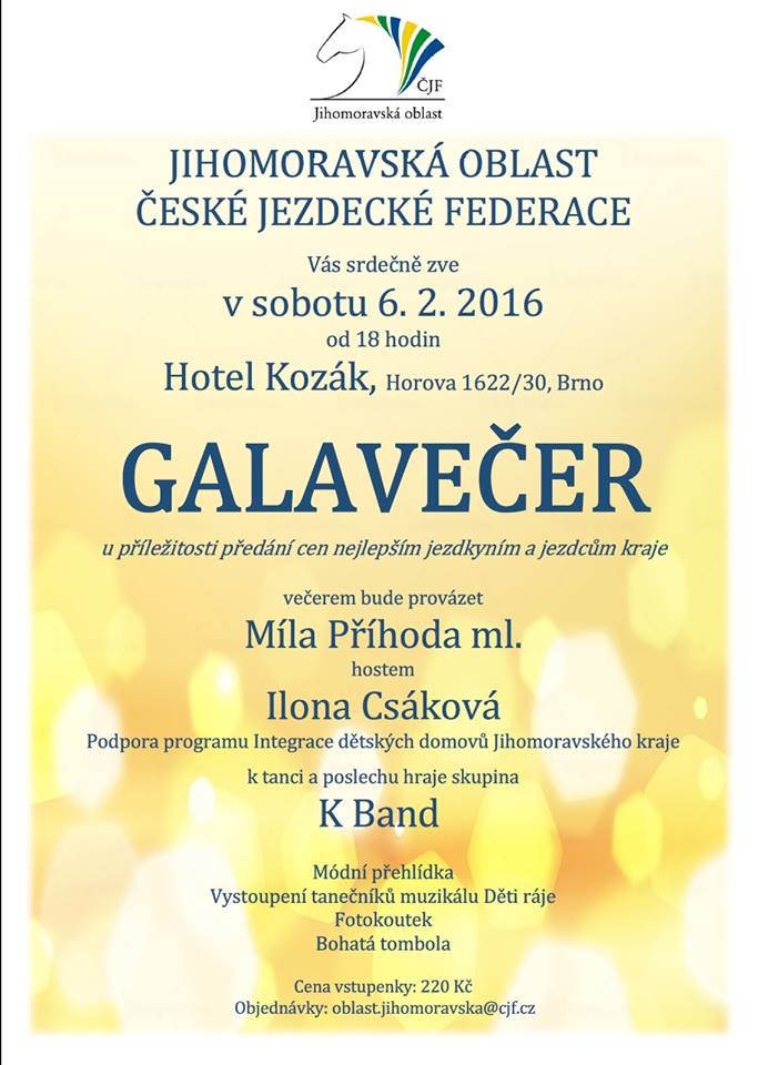 Opět se blíží doba bilancování a hodnocení uplynulé sezony a protože se nás na to ptáte, přinášíme seznam galavečerů a slavnostních vyhodnocení spojených s příjemnou zábavou. Pošlete nám i vy informace o vaší akci na web@jezdectvi.cz. Nezapomeňte, že galavečer jezdectví Koně na Žofíně se koná 5. března 2016. Aktualizace 20. 2. Dnes můžete navštívit Galavečer Zlaté podkovy v Humpolci a ples Středočeské oblasti.