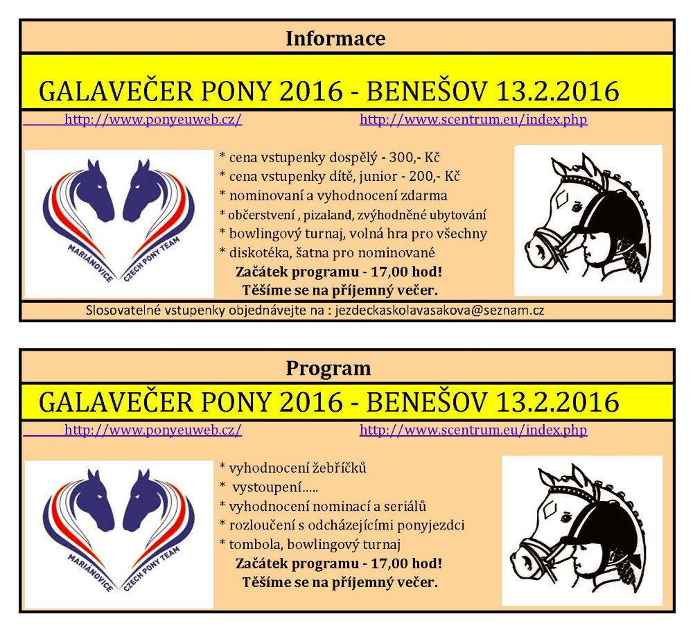 Galavečer pony se bude konat 13. února 2016 v Benešově u Prahy (S-Centrum) od 17.00 hodin. Cena vstupenky dospělý 300 Kč, dítě (junior) 200 Kč. Více v pozvánce.