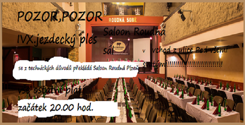 Ve společenském domě v Plzni Skvrňanech POZOR: Z technických důvodů se ples uskuteční v sálu Saloon Roudná od 20.00 hodin. Vchod z ulice Pod všemi svatými, ne přes restauraci. Vstupné 200 Kč. Změna místa konání. Pozvánka. Seznam vyhodnocených jezdců.