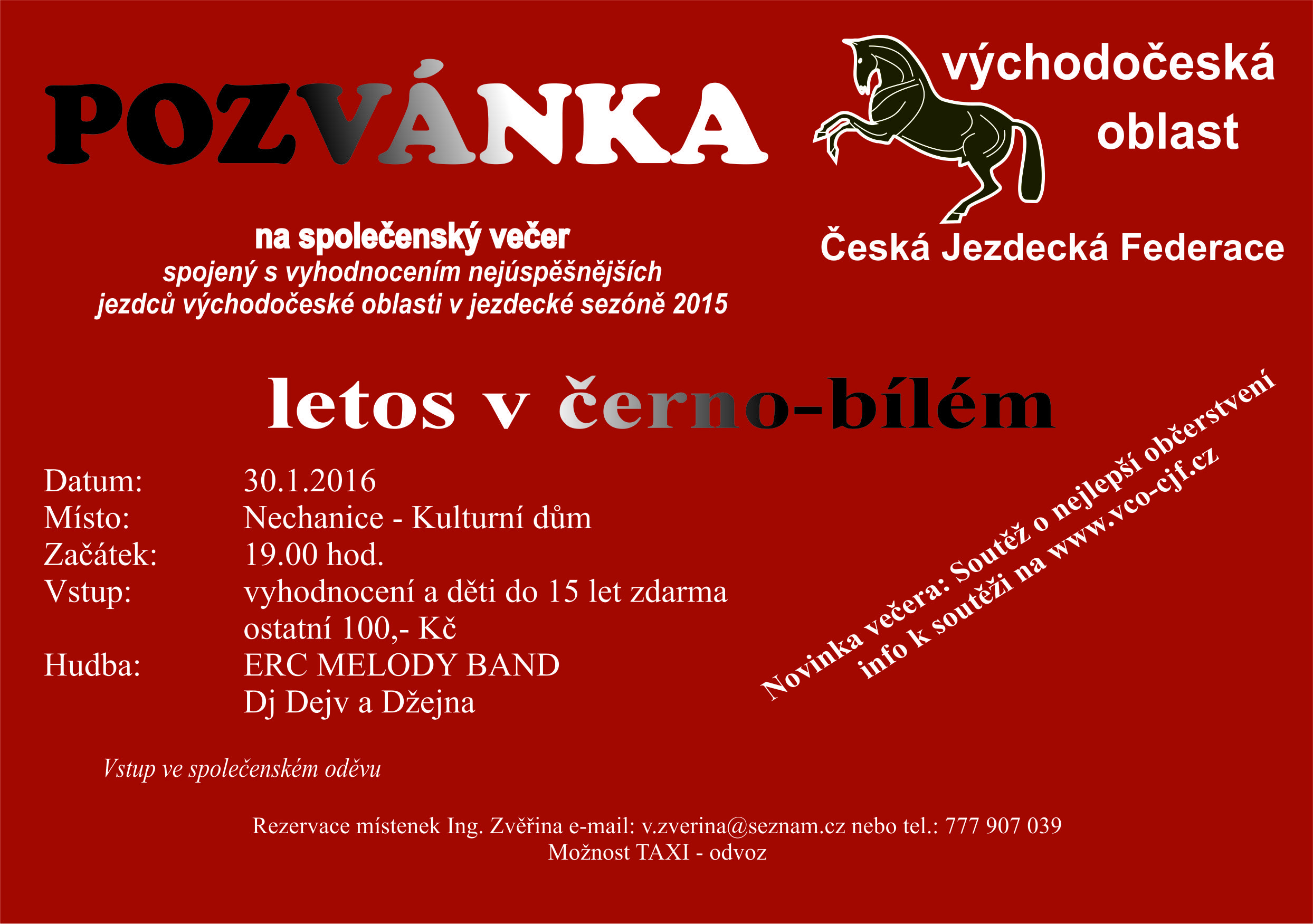 Společenský večer s vyhodnocením nejúspěšnějších jezdců vychodočeské oblasti. Letos v černo-bílém. Od 19.00 hodin v kulturním domě v Nechanicích, vstupné 100 Kč. Více v pozvánce.
