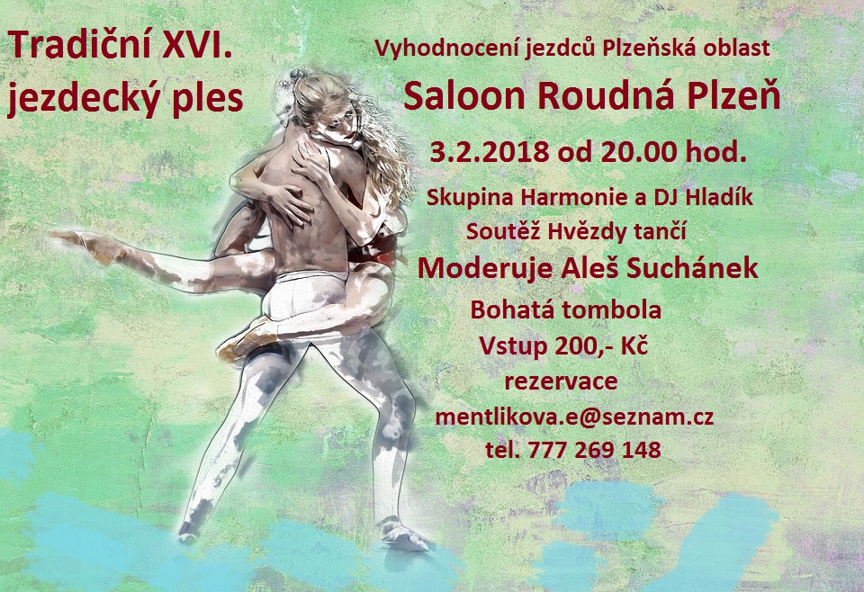 Národní hřebčín Kladruby nad Labem si Vás srdečně dovoluje pozvat na tradiční jezdecký ples, který se bude konat v sobotu 13. ledna 2018 od 20.00 hod. v sále Císařského hostince v Kladrubech nad Labem. K tanci a poslechu hraje skupina Technics. Více informací a rezervace vstupenek na e-mailu: kladruby@nhkladruby.cz nebo na tel. č. 607 093 685 (Simona Králová). Vstupné 100,- Kč, pro zaměstnance Národního hřebčína je vstup zdarma.