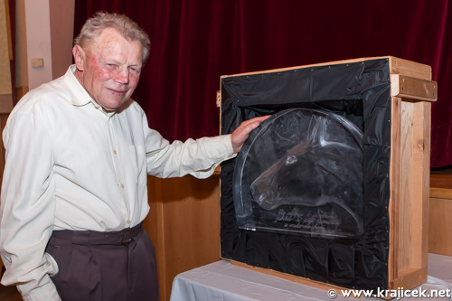 Ke svým 80. narozeninám dostal Stanislav Beránek od kamarádů a milovníků koní krásnou skleněnou hlavu koně.