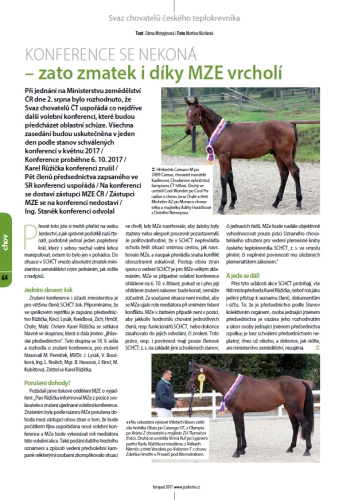 Při jednání na Ministerstvu zemědělství ČR dne 2. srpna 2017 bylo rozhodnuto o volební konferenci / Konference proběhne 6. 10. 2017 / Karel Růžička konferenci zrušil / Předsednictvo konferenci uspořádá / Na konferenci se dostaví zástupci MZE ČR / Zástupci MZE se na konferenci nedostaví / Ing. Staněk konferenci odvolal / MZE ČR nepřiznalo spolku dotace pro rok 2017 / Ve SR zapsány nové stanovy / Insolvenční návrh na svaz / Memorandum SCHČT a ASCHK o společném postupu / Chovatelé sobě / Výzva Aleše Fialy chovatelům ČT / Činnost sekretariátu / Výzva k úhradě členských příspěvků / Pozvánka na celostátní konferenci / Zápis z kontrolního dne / Reakce na zápis Kontrolní komise / Zápis z konference / Komu připadne statut UCHS / Zápis předsednictva SCHČT / UCHS pro ASCHK