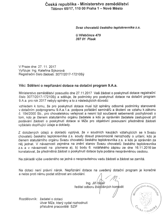 30. 11. Tisková zpráva SCHČT – nepřiznání dotací pro rok 2017 Ministerstvem zemědělství