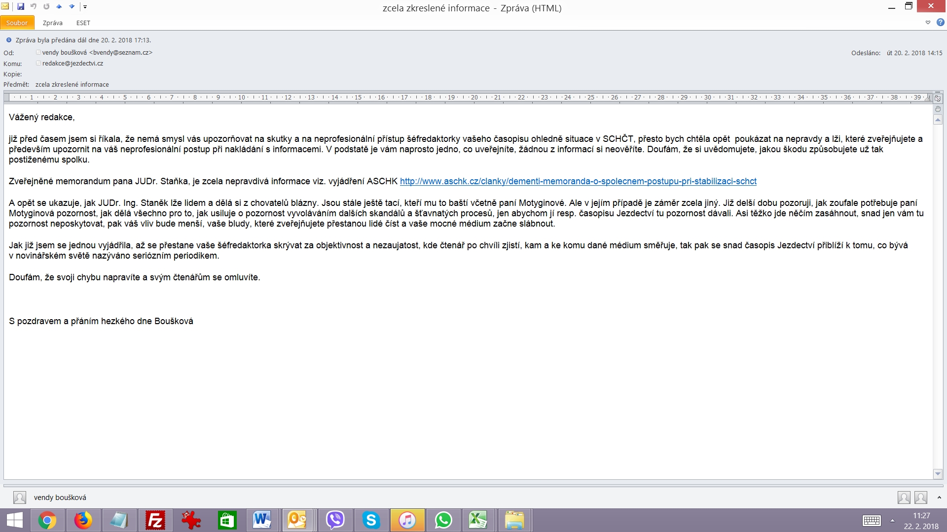 20. 2. email redakce Dopis Václavy Bouškové redakci Jezdectví