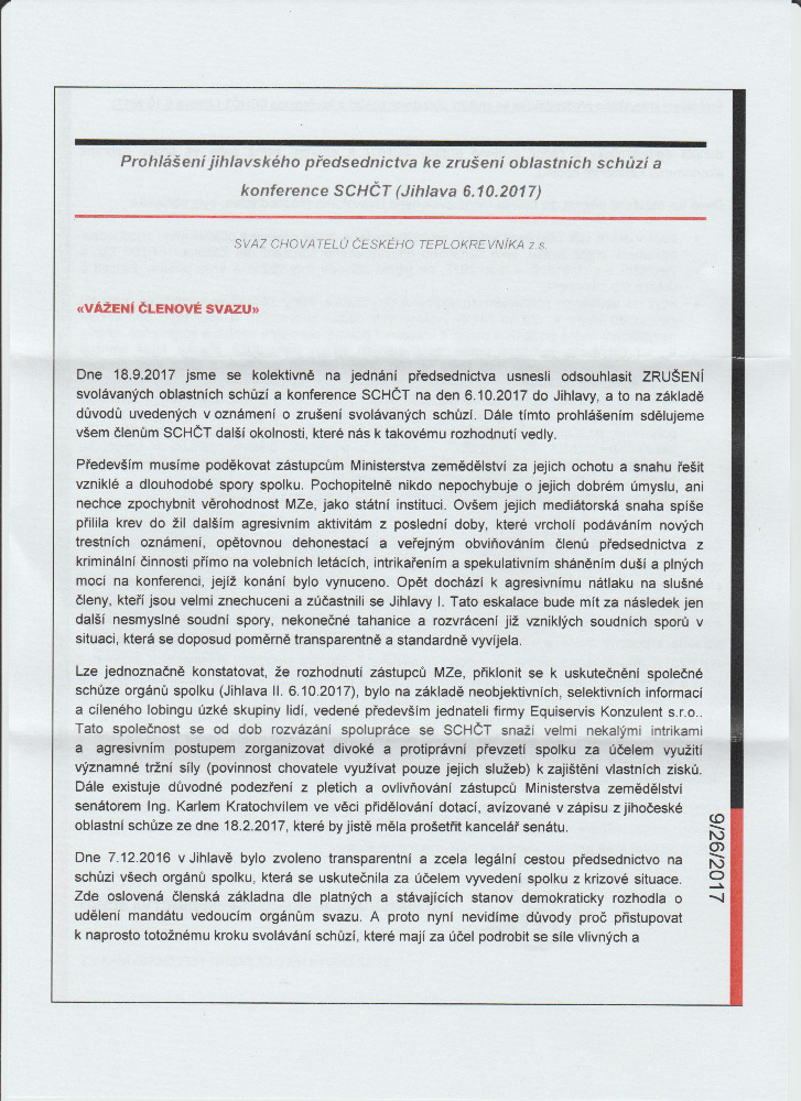 8. 1. www.schct.cz Oficiální prohlášení členů statutárního orgánu SCHČT z. s. (autor Karel Růžička, MVDr. Josef Lysák, Josef Kincl)