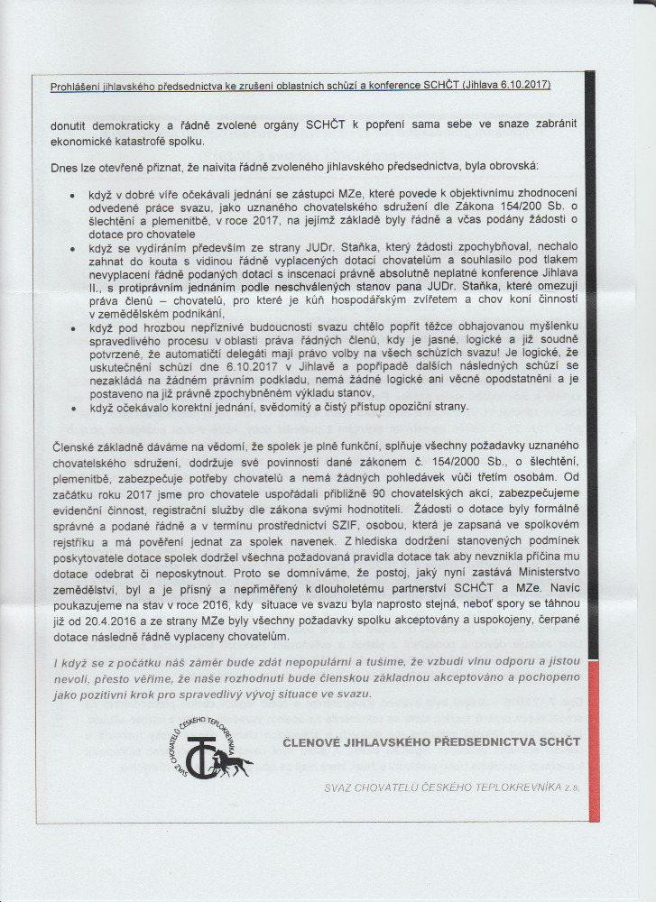 26. 6. facebook Druhá strana mince, autor Petra Hurtíková, tajemnice SCHCT: Vážení příznivci SCHČT, svaz ještě nezemřel, jak je prezentováno v petici. A nezemře ani zítra. Předseda a předsednictvo se snaží o jeho zachování. Bude si žít svým vlastním životem pod křídly ASCHK ČR. Bude mít své předsednictvo, Radu PK, členy. Předsednictvo se snaží o jeho zachování vzhledem k jeho dlouholeté tradici a vzhledem k tomu, že jsou v běhu některé soudní spory, které je nutno dotáhnout do konce. Předsednictvo se po dlouhé úvaze rozhodlo podat žalobu na MZe ČR ohledně nevyplacení dotací za rok 2017. Tato žaloba má reálnou šanci na úspěch a v případě jejího úspěchu by z toho byl svaz venku. I z tohoto důvodu je potřeba IČO zachovat.