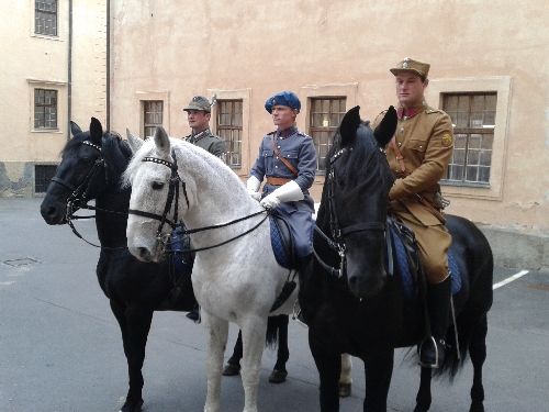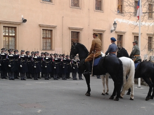 Hradní stráž jako jediný útvar v rámci ozbrojených sil existuje od roku 1918 až do současnosti. A proto dne 6. prosince 2013 byly zahájeny oslavy slavnostním nástupem na I. nádvoří Pražského hradu. Za pochodu hudby Hradní stráže se představila i trojice jezdců na koních z Národního hřebčína Kladruby nad Labem, s. p. o. Jezdci se prezentovali v historických stejnokrojích francouzských, ruských a italských legionářů. Jejich hlavním posláním bylo přivézt historickou prezidentskou standartu. Jiřího Nesvačila ml. jsme mohli vidět na vraném starokladrubském hřebci Solo Xantora XVII-27 . Radek Nesvačil jel na vraníku Sacramoso Siria I – 29 a nakonec zástupce bílých starokladrubských koní hřebec Generale Aversa XLIX absolvoval přehlídku s jezdcem Jakubem Hlávkou.