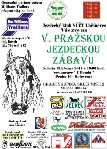Jezdecký klub VÚŽV Uhříněves pořádá v sobotu 19. března od 19:00 V. Pražskou jezdeckou zábavu. Tato akce proběhne v restauraci „U Boudů“ (Praha 10 – Kolovraty).