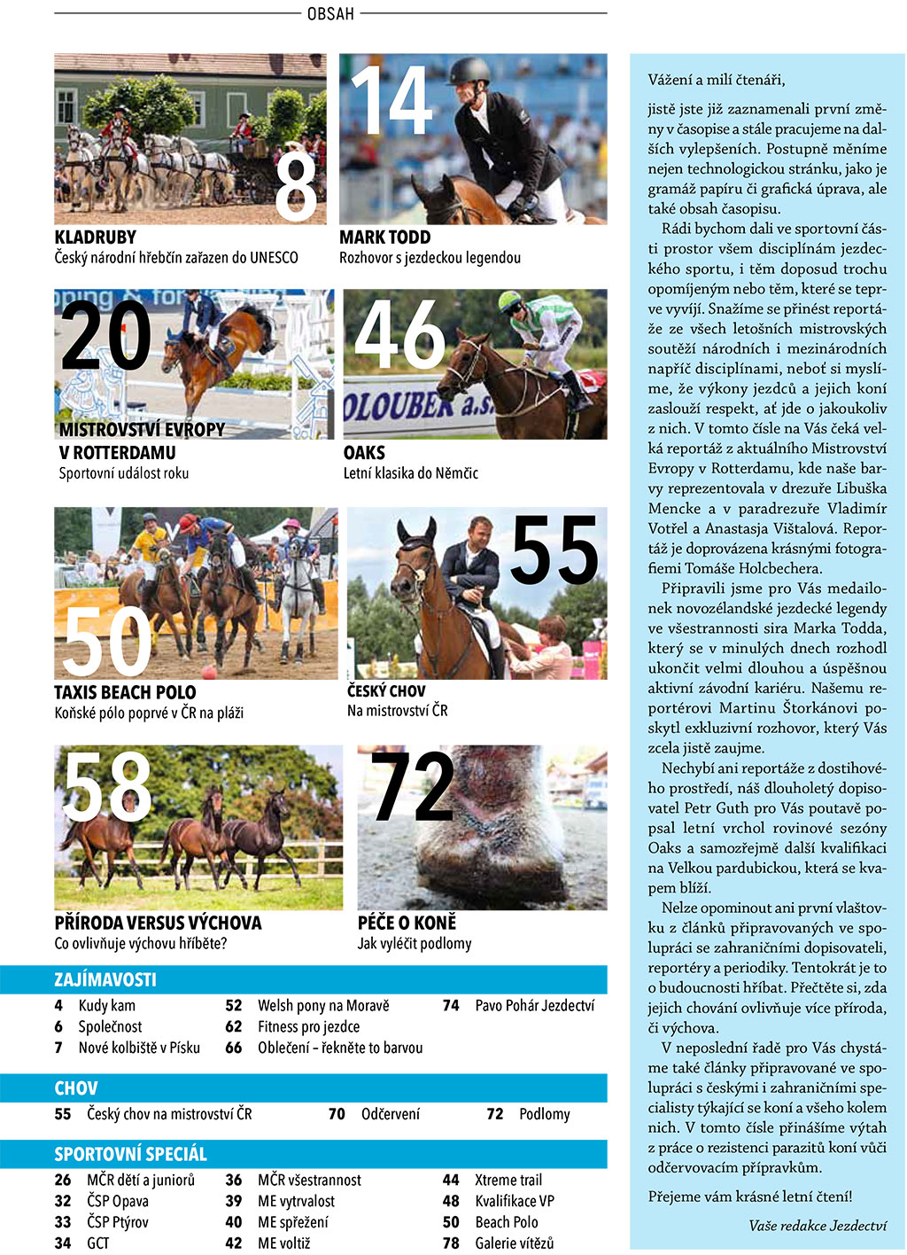 Dnes vychází nové číslo našeho časopisu, ve kterém si můžete přečíst zajímavý exkluzivní rozhovor s Markem Toddem, poutavou reportáž z Mistrovství Evropy v Rotterdamu, něco z historie národního hřebčína v Kladrubech a spoustu dalších zajímavých článků ze sportu, z chovu či o péči o vaše čtyřnohé koňské miláčky. A jelikož časopis děláme pro vás, budeme moc rádi, když nám napíšete vaše názory, jak se vám články líbí nebo co byste rádi v časopise chtěli číst.