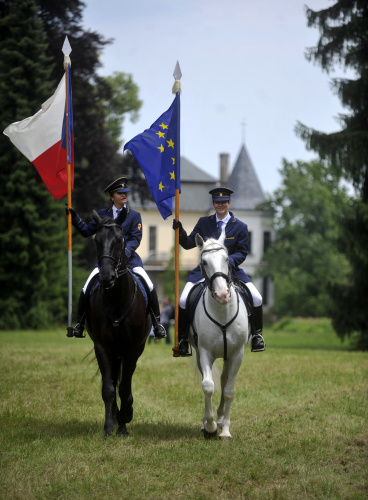 Národní hřebčín Kladruby nad Labem, s.p.o. uspořádal v sobotu 28. června v zámeckém parku ve Slatiňanech Velký jezdecký den. Pro diváky byl připraven bohatý program, který zahájili praporečníci přesně ve 13:00 hodin. Vlajkonoši pak přivedli do kolbiště průvod realizačního týmu vedený ředitelem NHK Ing. Jiřím Machkem na plemenném hřebci Generale Pastorella VII..