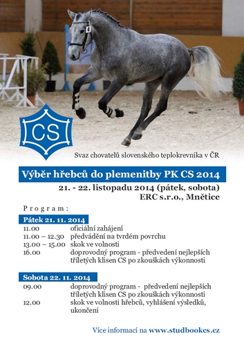 Ve dnech 21. – 22. listopadu se v ERC s.r.o., Mnětice koná výběr hřebců do plemenitby PK slovenského teplokrevníka 2014. Doprovodným programem bude předvedení nejlepších tříletých klisen CS po zkouškách výkonnosti (předvedení ve volnosti v pohybu, skok ve volnosti). Aktualizace 13. 10. 16 HOD: Vložen plakát s časovým programem. 19. 11. 15:20 HOD: Seznam přihlášených hřebců zde. 22. 11. 23:40 HOD: Vítězem se stal Chin Champ´s Calando majitele L. Kozáka. 24. 11. 16:55 HOD: Přiloženy protokoly hřebců.