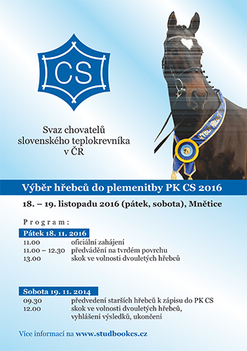 Svaz chovatelů slovenského teplokrevníka v ČR zve všechny v termínu od 18. – 19. listopadu do Mnětic na výběr hřebců do plemenitby PK CS 2016. Kvůli malému počtu přihlášených hřebců je předvýběr spojen s předvedením hřebců po 80denním testu. Program, pozvánka a katalog hřebců uvnitř. Vítězem se stal písecký Capibara, druhý skončil Jaguar a třetí Armani. Ze starších byli vybráni Lupo a Cachas, z hřebců po 80denním testu Karachi, Dartoni a Esman. Uvnitř najdete videa z pátku, na našem facebooku videa ze soboty.