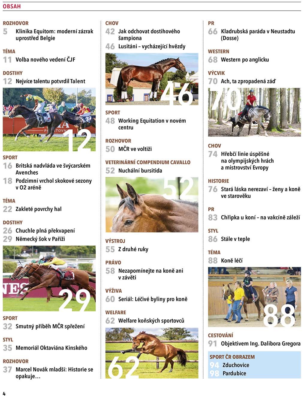 V listopadovém čísle najdete rozhovor s dr. Tomem Mariënem, zakladatelem prestižní koňské veterinární kliniky Equitom v Belgii. Máme pro vás článek o průběhu 131. Velké Pardubické, ale i o MČR ve voltiži či o MČR spřežení. Dále se v časopise dočtete o welfare koňských sportovců nebo o výběru sedel z druhé ruky.