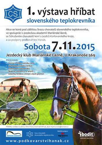 Pod záštitou Svazu chovatelů slovenského teplokrevníka se uskuteční v sobotu 7. listopadu od 10.00 hodin v areálu jezdeckého klubu Mariánské lázně 1. výstava hříbat slovenského teplokrevníka. Program s pozvánkou najdete uvnitř článku.