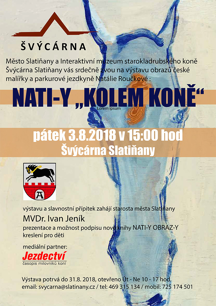 Město Slatiňany a Interaktivní muzeum starokladrubského koně Švýcárna Slatiňany srdečně zvou na výstavu obrazů české malířky a parkurové jezdkyně Natálie Roučkové s názvem: Nati-Y „Kolem koně“. Výstavu a slavnostní přípitek zahájí starosta města Slatiňany MVDr. Ivan Jeník v pátek 3. srpna v 15 hodin. Výstava potrvá do 31. srpna.