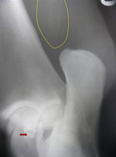 Klisna Penelope, ČT, 12 let, trpící chronickým zánětem šlachové pochvy šlachy společného ohybače prstu (žlutá) s nálezem kloubního tělíska v hlezenním kloubu (červená šipka).