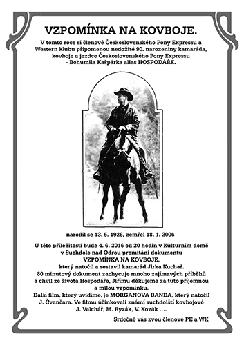 V tomto roce si členové Československého Pony Expressu a Western klubu připomenou nedožité 90. narozeniny kamráda, kovboje a jezdce Československého Pony Expressu – Bohumila Kašpárka alias Hospodáře. Více v článku.