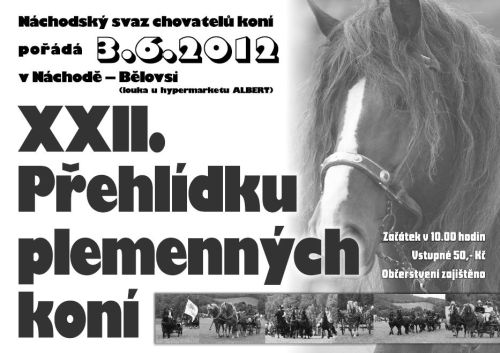 Náchodský svaz chovatelů koní pořádá v neděli 3. 6. v Náchodě-Bělovsi již XII. Přehlídku plemenných koní. Vše vypukne v 10 hodin, vstupné činí 50 kč a občerstvení bude zajištěno. Plakát najdete uvnitř článku.