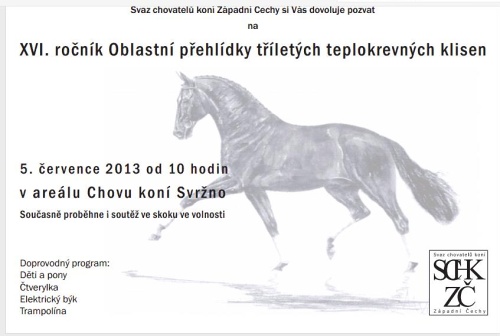 Svaz chovatelů koní Západní Čechy pořádá dne 5. července XVI. ročník Oblastní přehlídky tříletých teplokrevných klisen. Akce začíná v 10 hodin v areálu Chovu koní Svržno. Pozvánku naleznete v článku.
