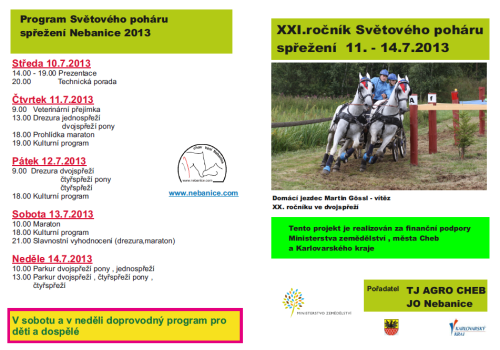 Ve dnech 11. – 14. 7. hostí Nebanice u Chebu již 21. ročník Světového poháru ve spřežení. Celá akce začíná již 10. 7. prezentací a technickou poradou. Podrobnější program naleznete v článku.