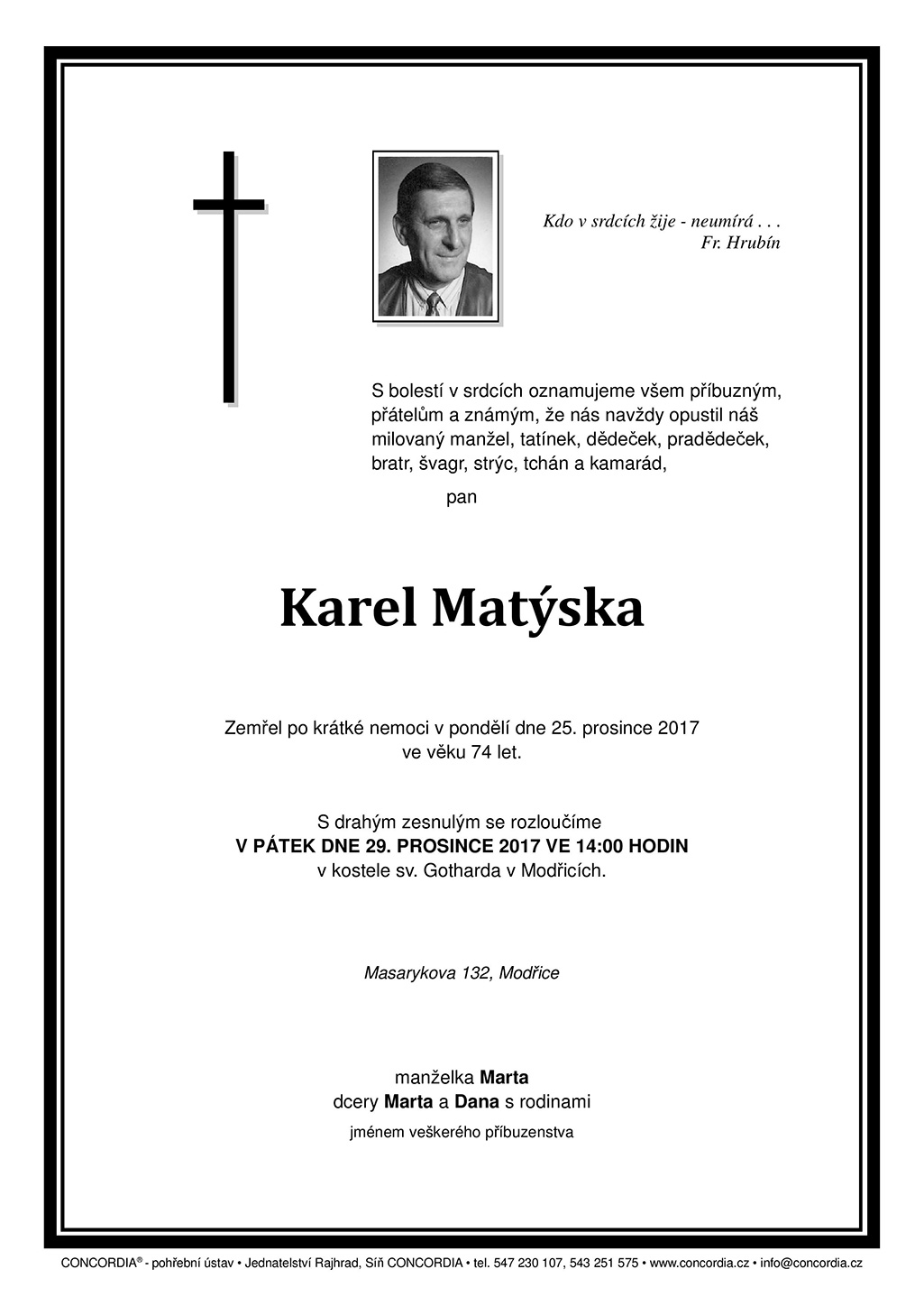 Dne 25. prosince 2017 zemřel pan Karel Matýska – významná osobnost jezdeckého sportu v Jihomoravské oblasti. Poslední rozloučení proběhne v pátek 29.12.2017 ve 14 hodin v kostele sv. Gotharda v Modřicích.